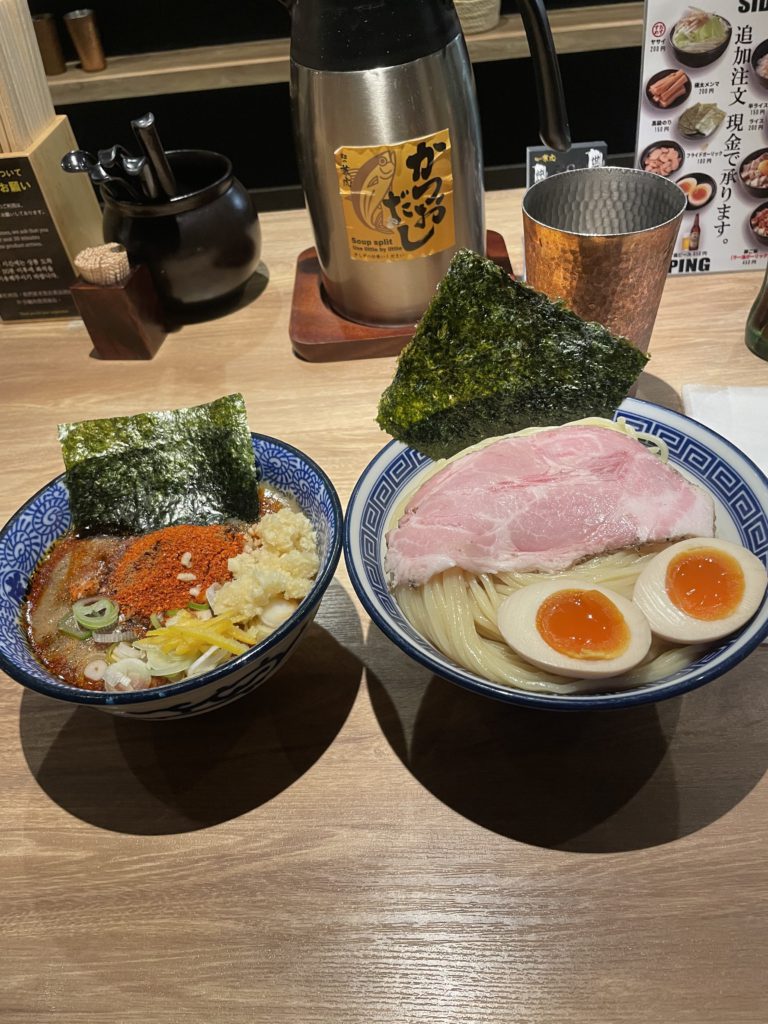 看板メニュー:濃厚魚介豚骨つけ麺、辛つけ麺